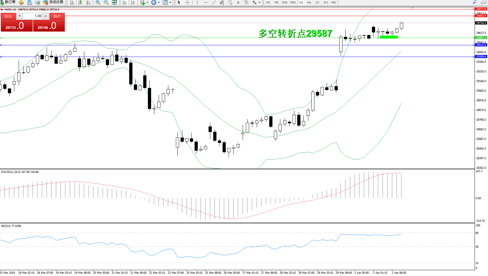 中国内地股市高开后全天维持宽幅震荡格局,截至收盘,香港恒生指数早盘高开后震荡走低,随后维持在略高于平盘线的水平盘整,截至收盘,恒指涨0.21%,报29624.67点。中美两国之经济数据齐优于预期,加上内地由4月1日开始,暂停征收美国进口汽车及零部件之关税,利好正在进行中的谈判。市场前期对经济的担忧得到改善。就目前状况而言,市场做多情绪依然浓厚。