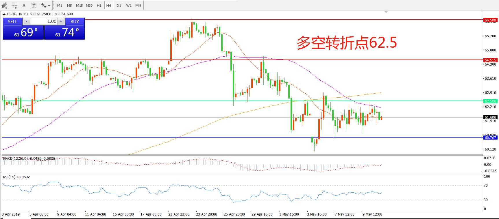 4小时图看,油价振幅逐渐收窄,三角形整理形态进入关键时期,如有单边突破行情,可顺势布局,短期均线走平,MACD绿柱减少, RSI指标拐头向上,日内延续震荡概率较大。