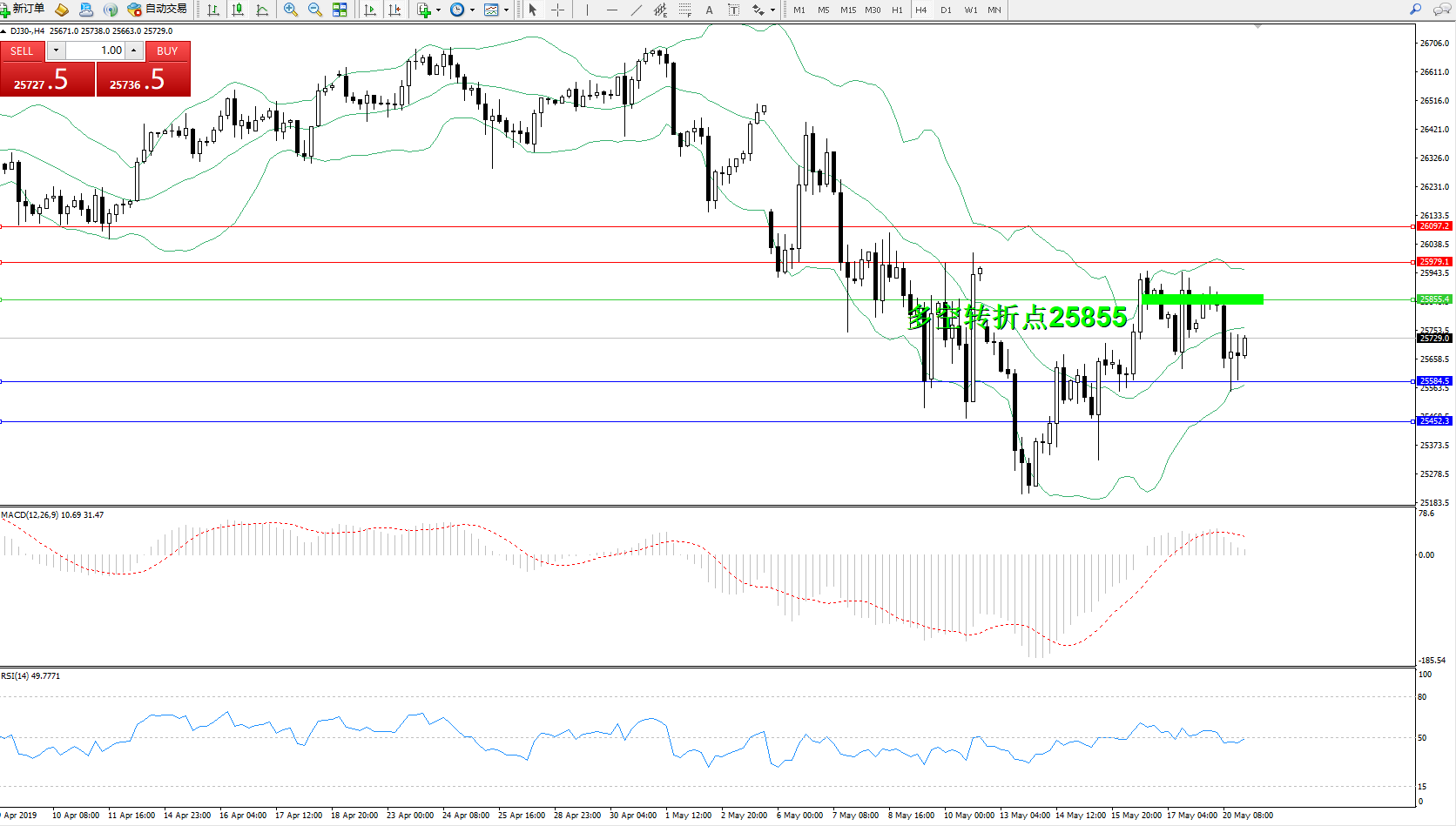 道琼斯指数DJ30—— 4小时K线图显示: