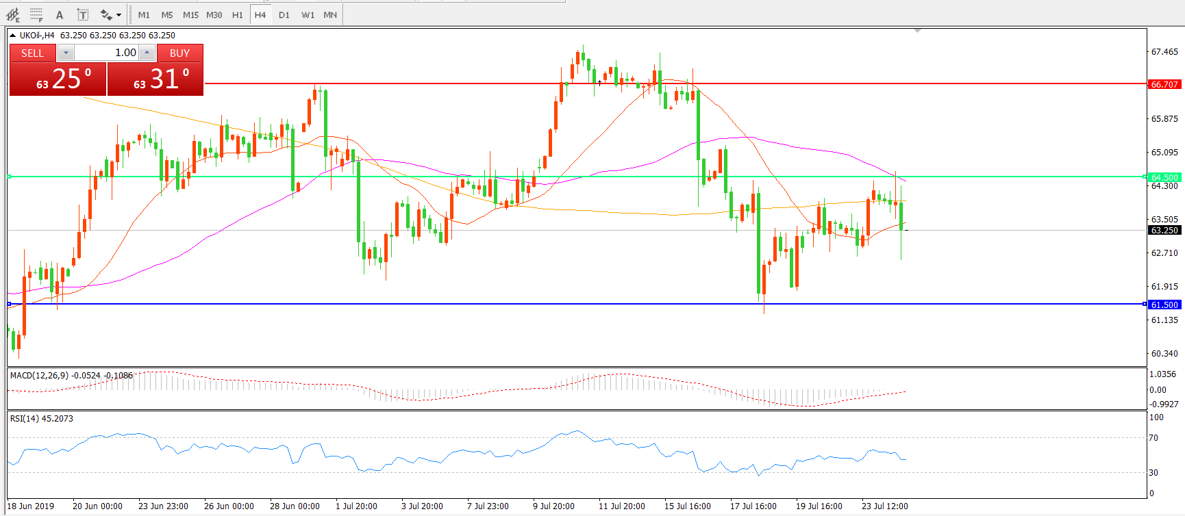 4小时图看,油价经历区间震荡后冲高回落,55周期均线形成上方阻力, MACD绿柱缩短, RSI指标走平,日内延续震荡概率较大。