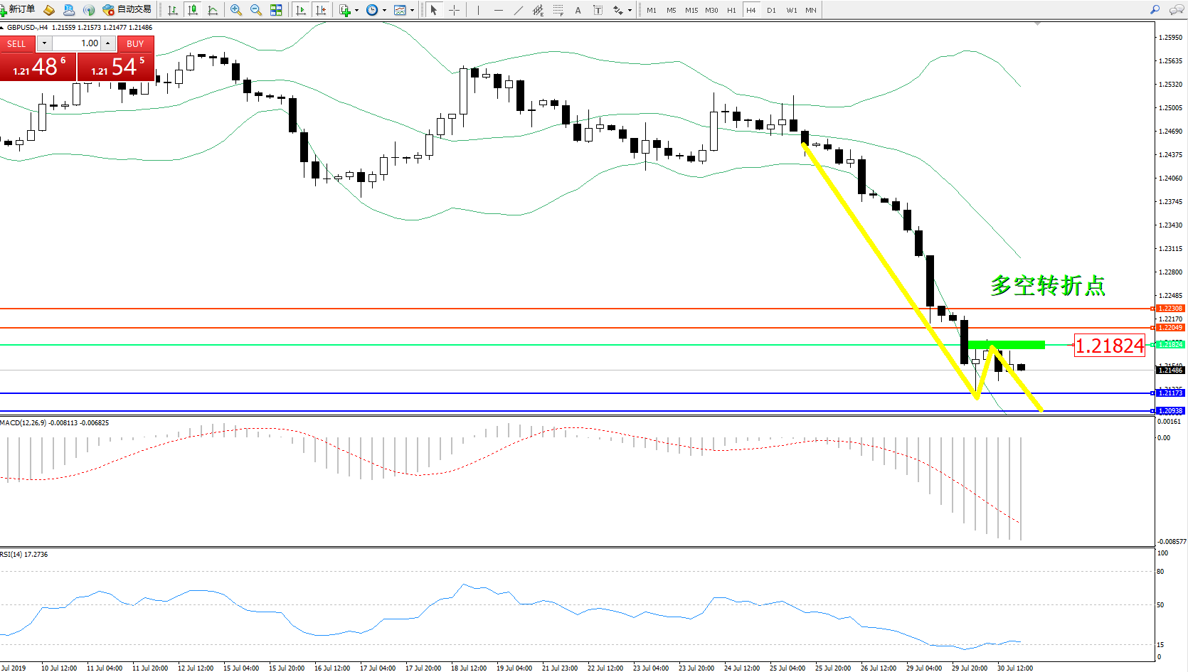 交易策略:1.21824下方看跌,目标1.21173、1.20938
