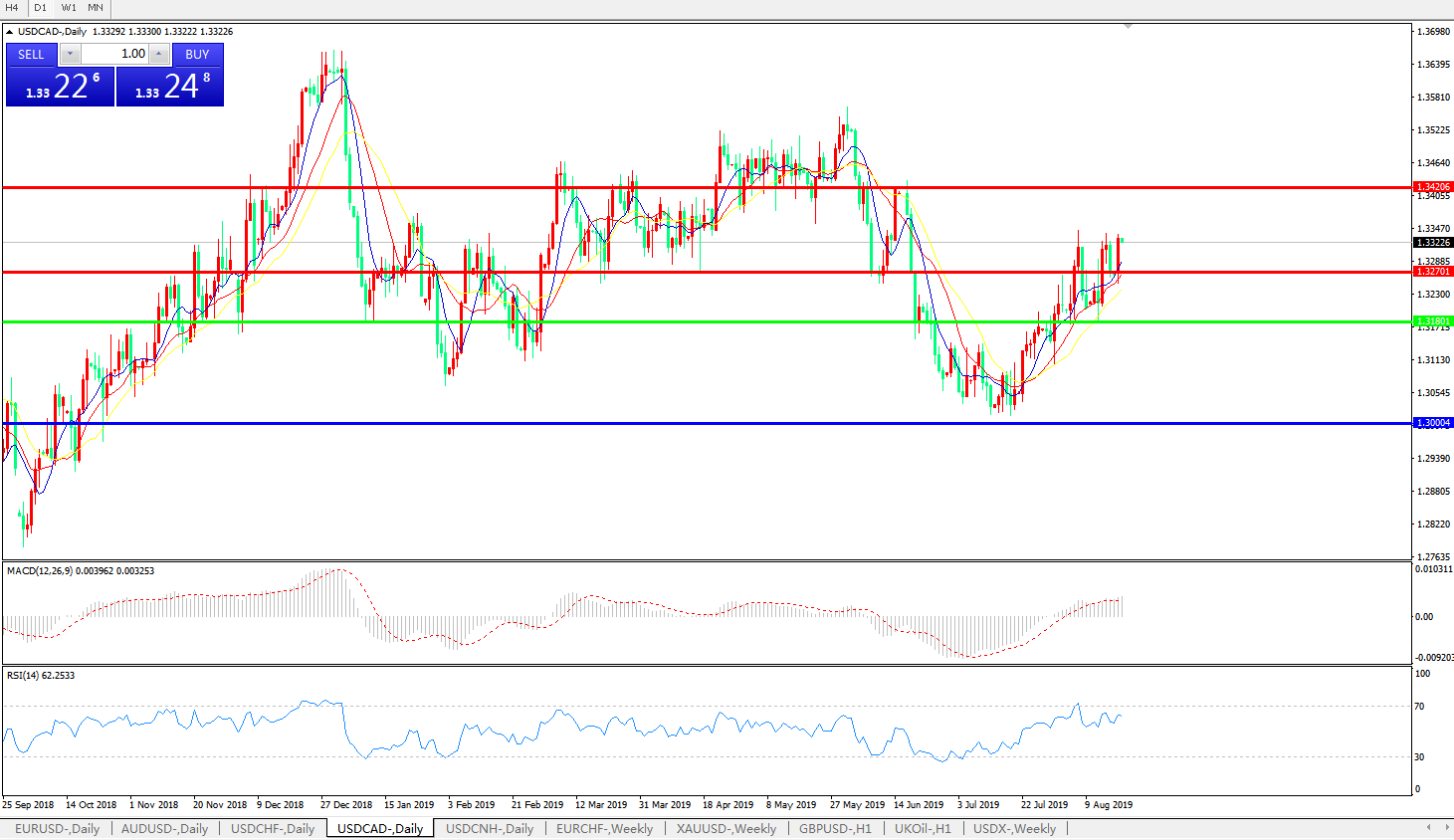 技术面简析:日线图均线整体呈发散上攻态势汇价昨日强势上攻再度触及近期高点MACD运行于0轴上方且动能柱量能维持,RSI呈整理震荡态势有上行倾向,预计汇价短期汇价料将进一步上行,试探1.34附近压制