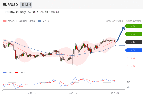 在 1.1620 之上,看涨,目标价位为 1.1660 ,然后为 1.1680 。