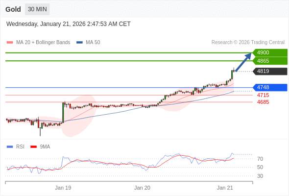 交易策略: 在 4748 之上,看涨,目标价位为 4865 ,然后为 4900 。