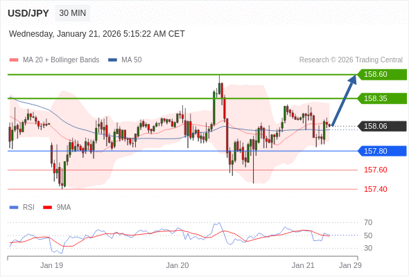 在 157.80 之上,看涨,目标价位为 158.35 ,然后为 158.60 。