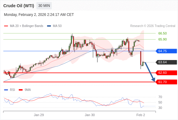 在 64.75 之下,看跌,目标价位为 62.60 ,然后为 61.70 。