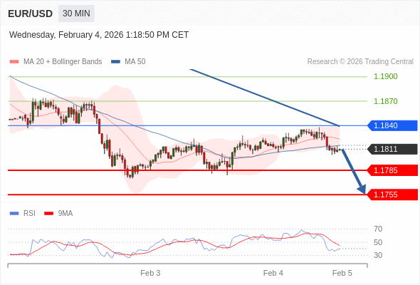 交易策略: 在 1.1840 之下,看跌,目标价位为 1.1785 ,然后为 1.1755 。