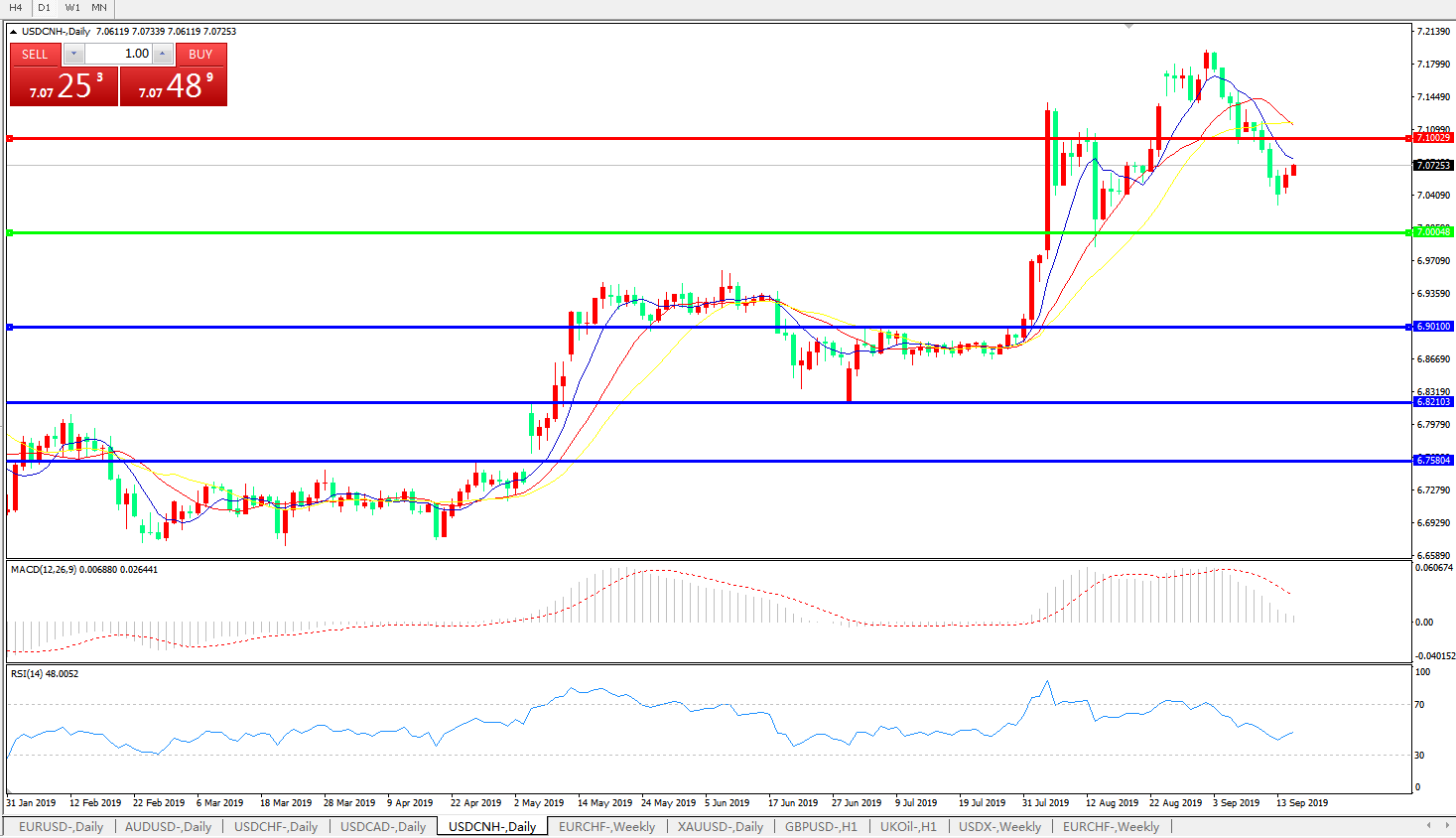 技术面简析:日图均线整体呈下行态势,汇价逼近7.0整数关口存一定支撑,MACD逼近0轴且动能有持续缩量迹象,RSI呈逐步下行态势,预计短期汇价将继续回落下行,上方重点关注7.10-7.20-7.30区间的压制;中美贸易谈判后续进展决定汇价中期走势。