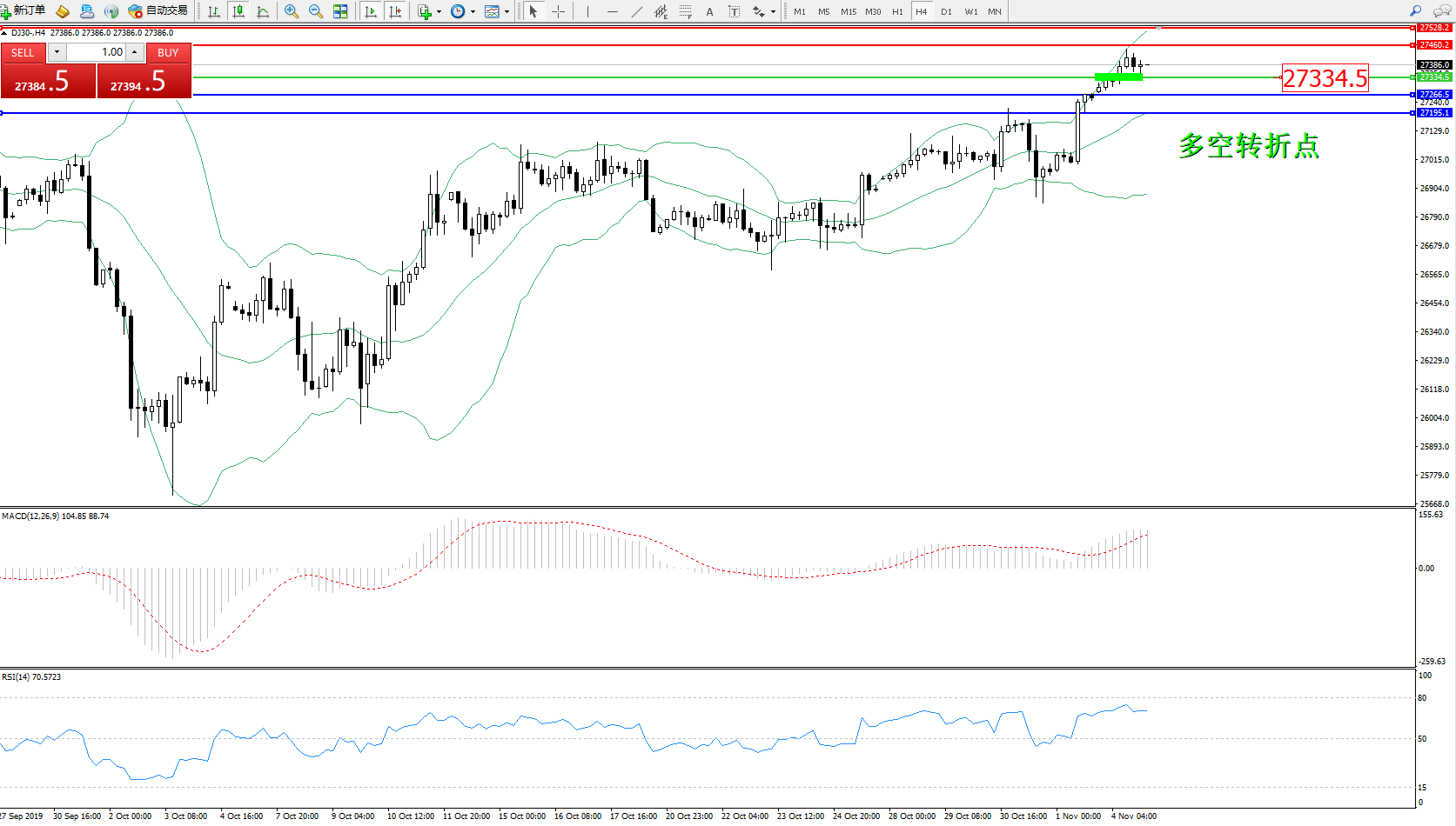 道琼斯指数DJ30—— 4小时K线图显示: