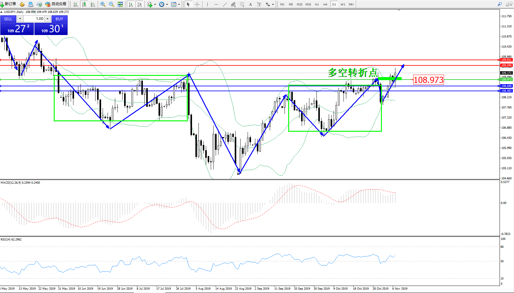 交易策略:108.973上方看涨,目标109.590109.831