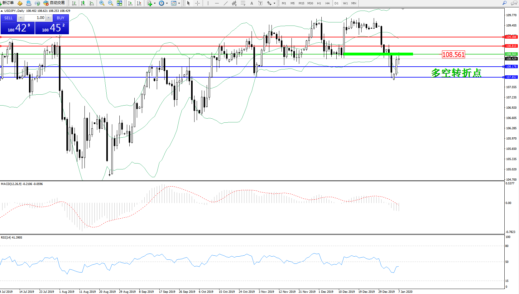 交易策略:108.561下方看跌,目标108.178、107.852