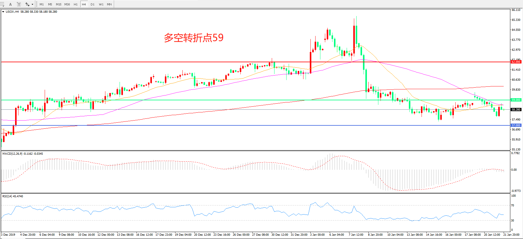 4小时图看,油价延续低位震荡走势,横盘仍然是近期走势的主基调,59美元是短期多空分水岭,如能顺利突破站稳,行情有望迎来反弹,均线系统走平,MACD绿柱减少RSI指标向上,日内震荡上行概率较大。