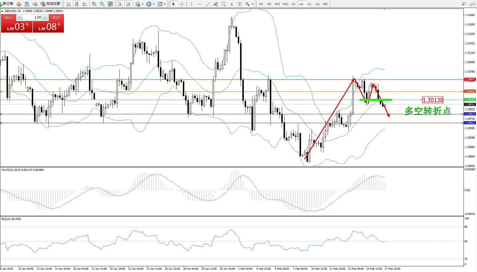 交易策略:1.30138下方看跌,目标1.298131.29612