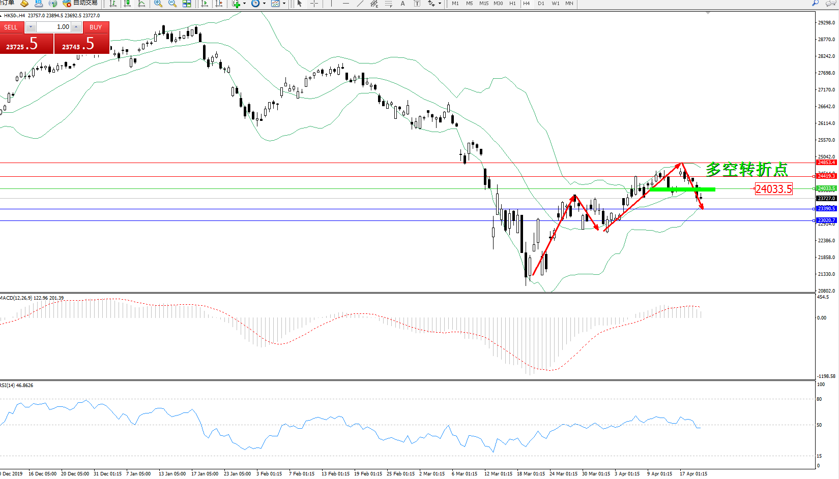 恒指HK50 ——4小时K线图显示: