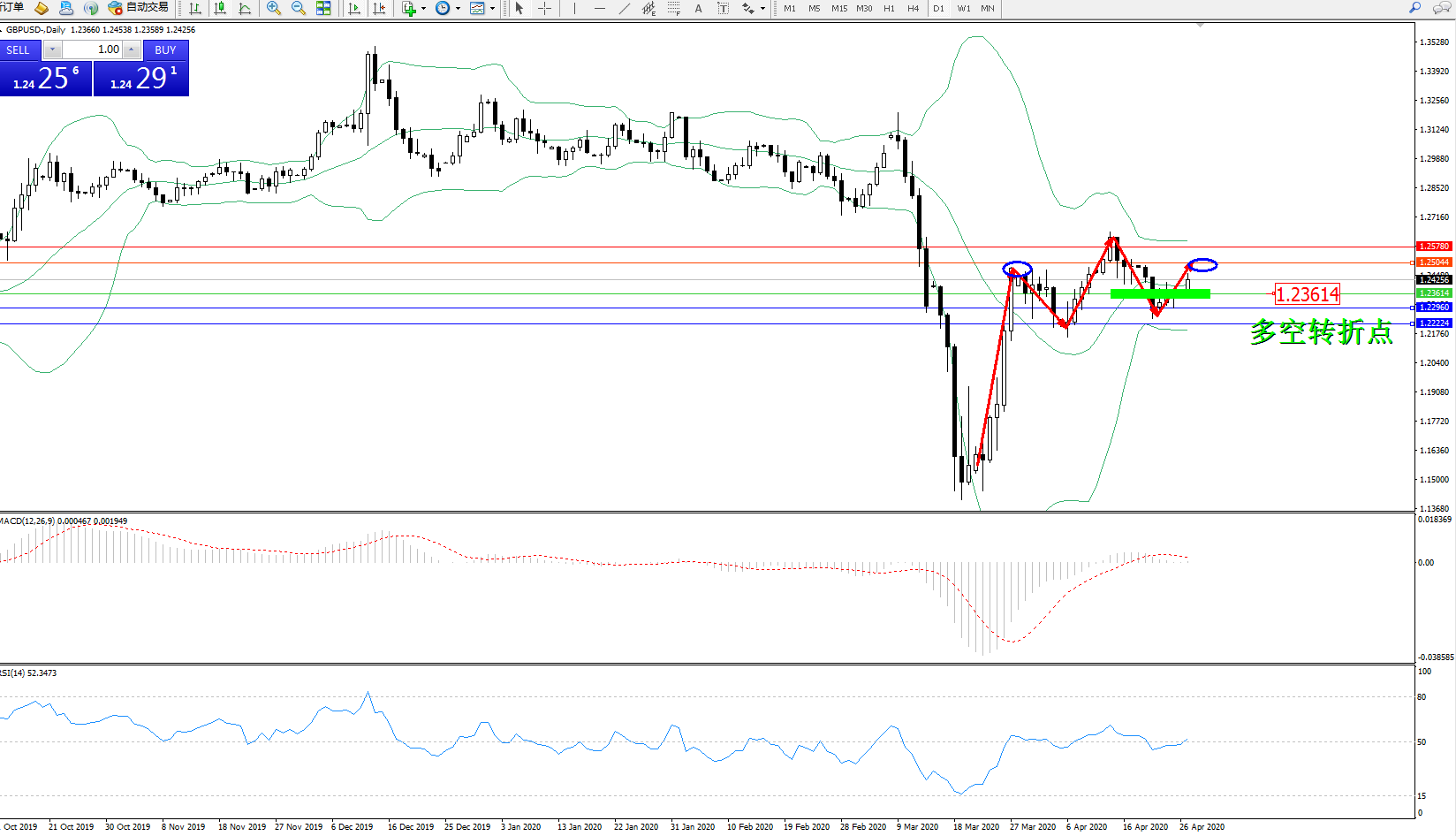 交易策略:1.23614上方看涨,目标1.25044、1.25780