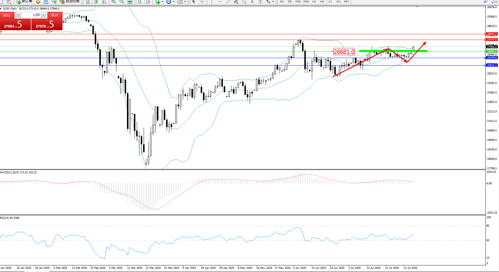交易策略:26681上方看涨,目标27577、28015