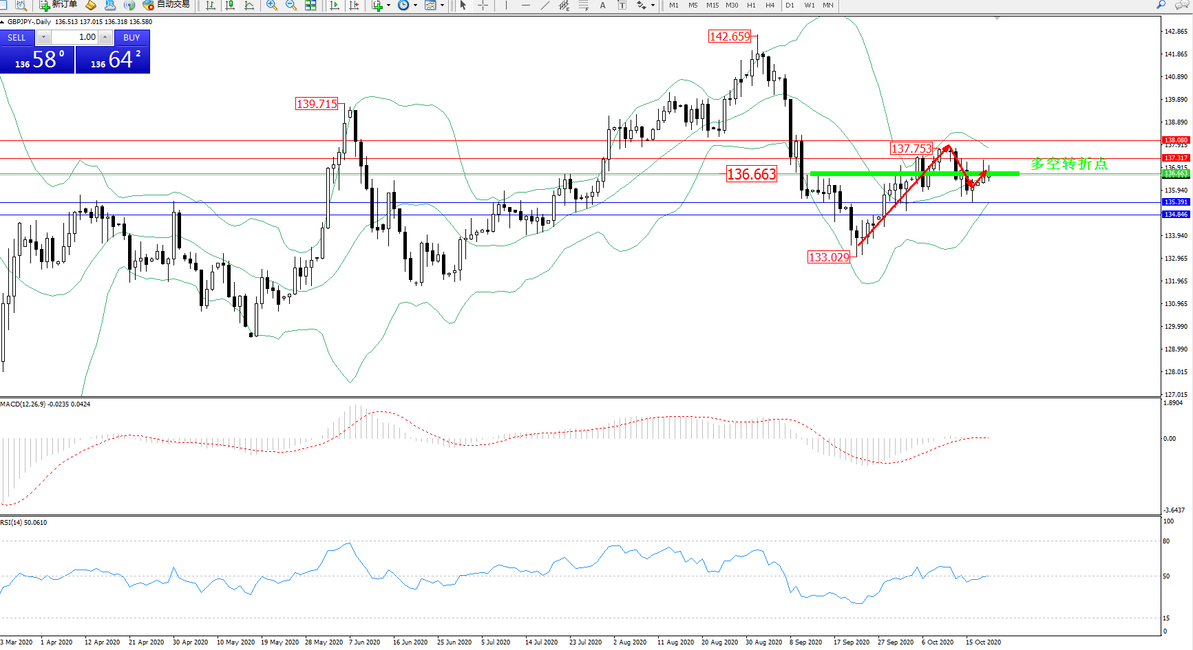 交易策略:136.663下方看跌,目标135.391、134.846
