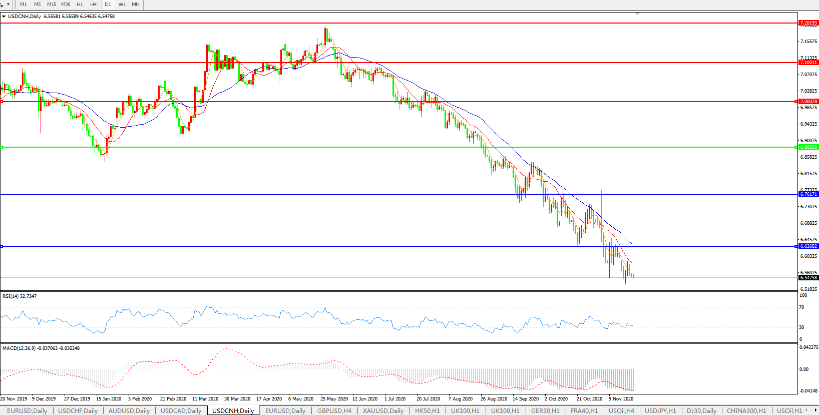 美元兑人民币USDCNH 日线图: