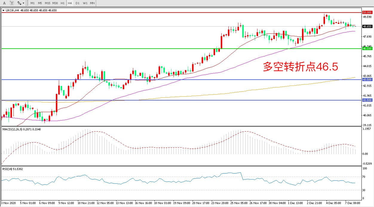 4小时图看,油价延续高位震荡,短期涨势有所回调55周期均线成为短期支撑50美元成为中期阻力MACD红柱减少,RSI指标走平,日内延续震荡概率较大。