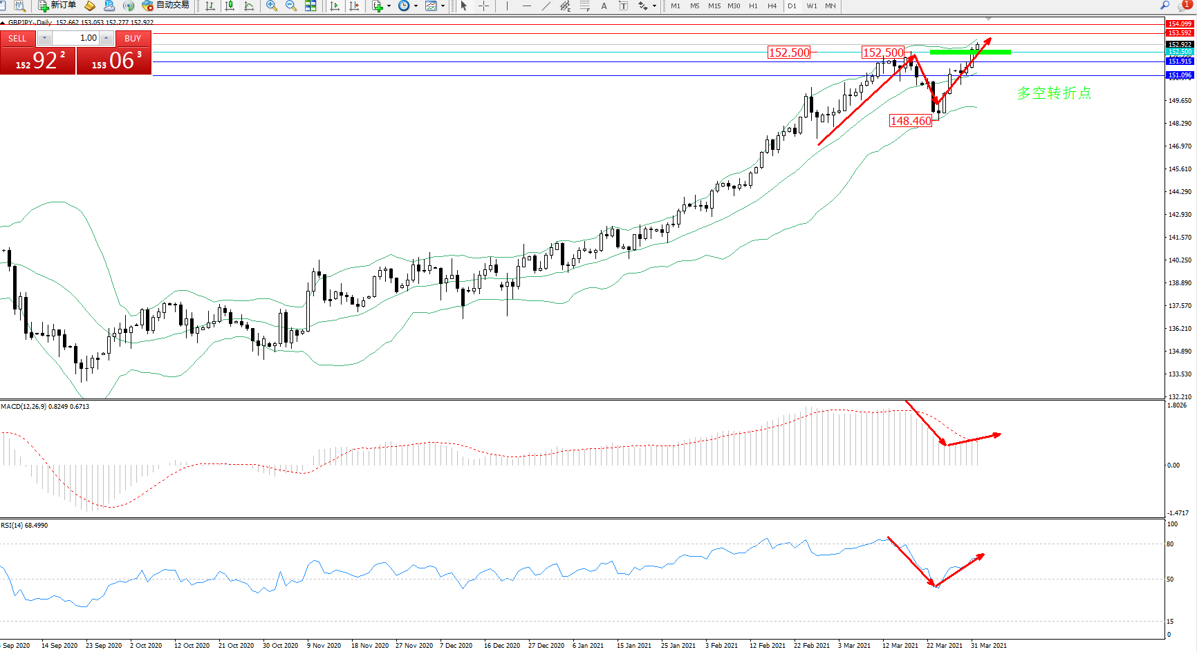 交易策略:152.500上方看涨,目标153.592、154.099