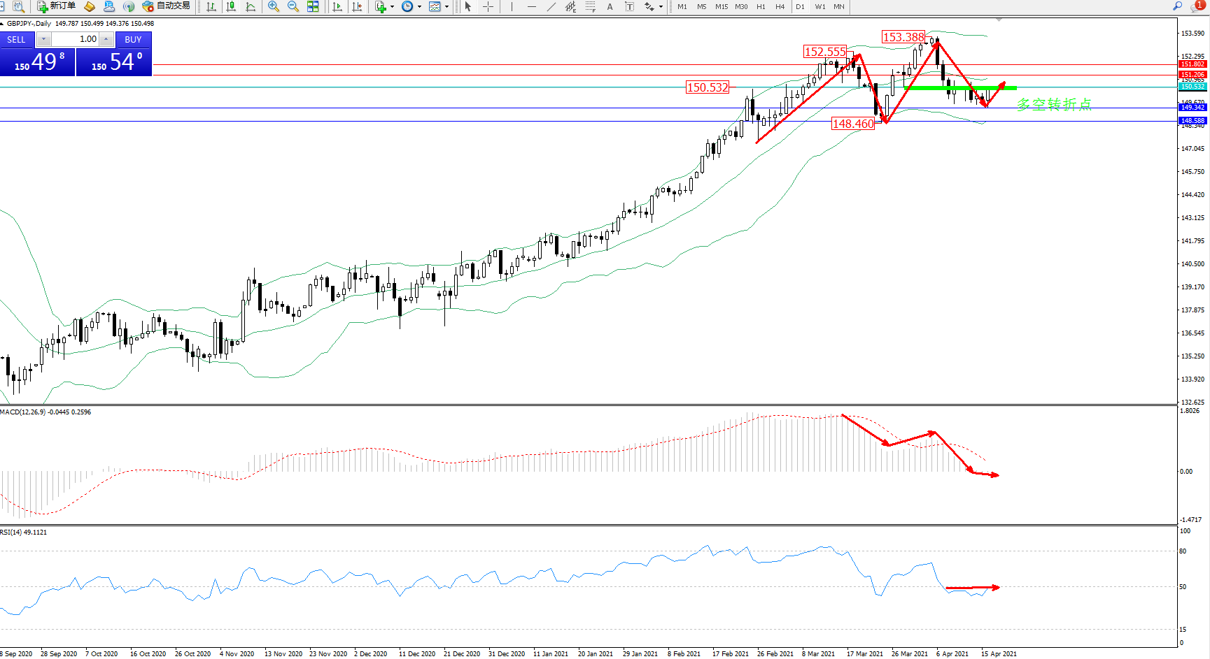 技术点评:技术点评:多头动力延续布林带指标通道持续震荡上扬,高位抵达153.388位置节点遇阻回撤,急速下挫至中下轨区间震荡下行中,空头动力日渐强劲,布林带指标不断拉升上扬后,高位开始有反转平移走势,MACD指标处于多头区域持续震荡向下移动中,RSI指标高位急速下挫至0轴线下方弱势徘徊有上移迹象;