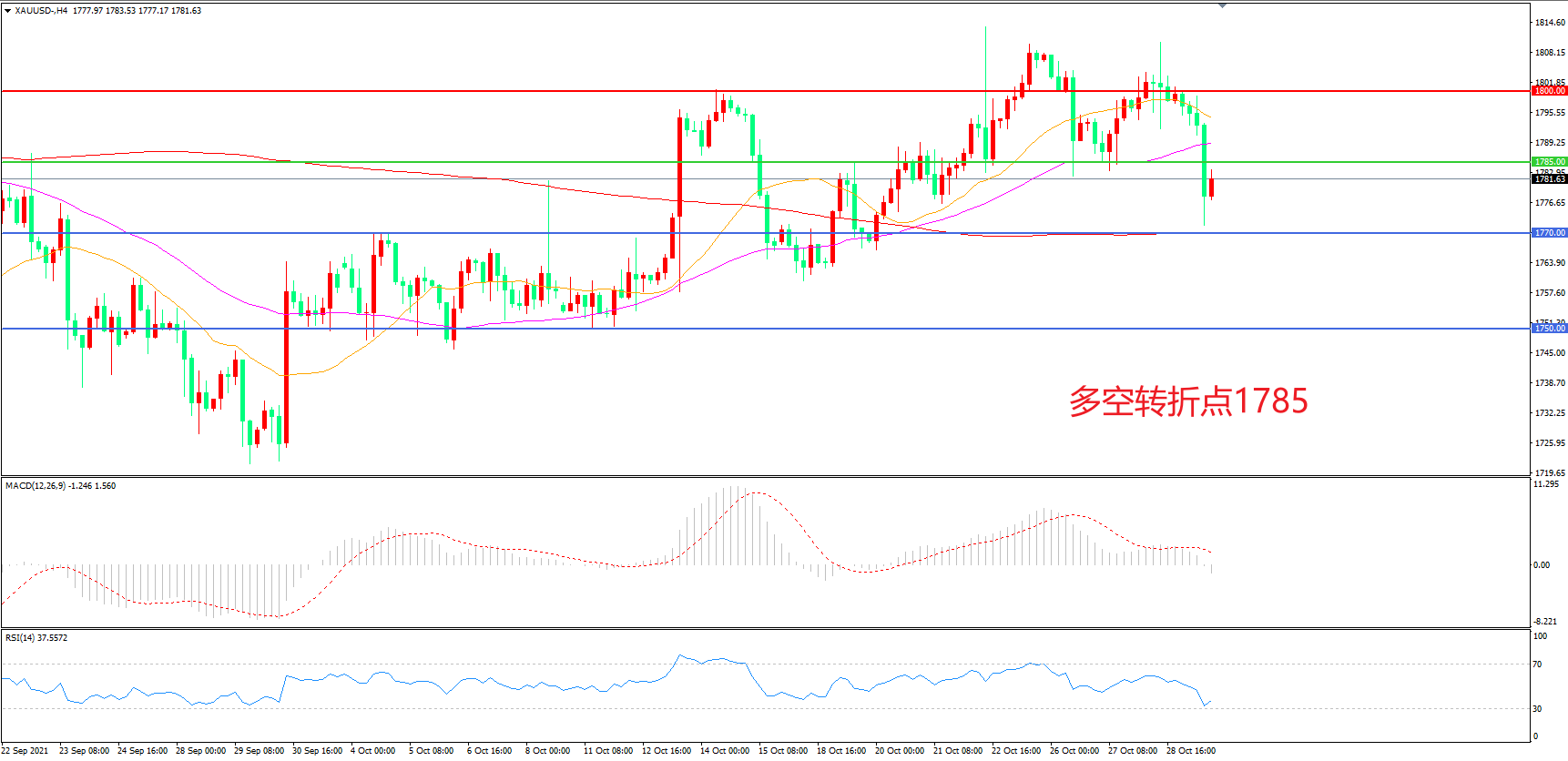 交易策略: 在1800.00之下看跌,目标1785.00 1770.00