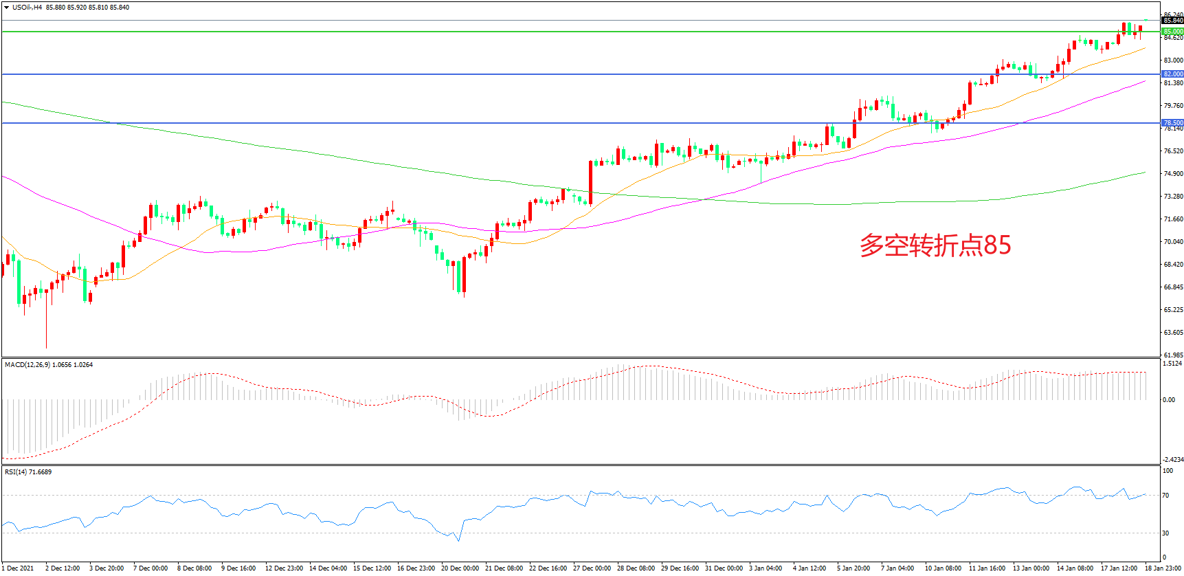 4小时图看,油价低点逐渐抬高,整体表现偏强,均线系统呈多头排列,84美元成为多空分水岭,MACD红柱增加,RSI指标走平,日内震荡上行概率较大。