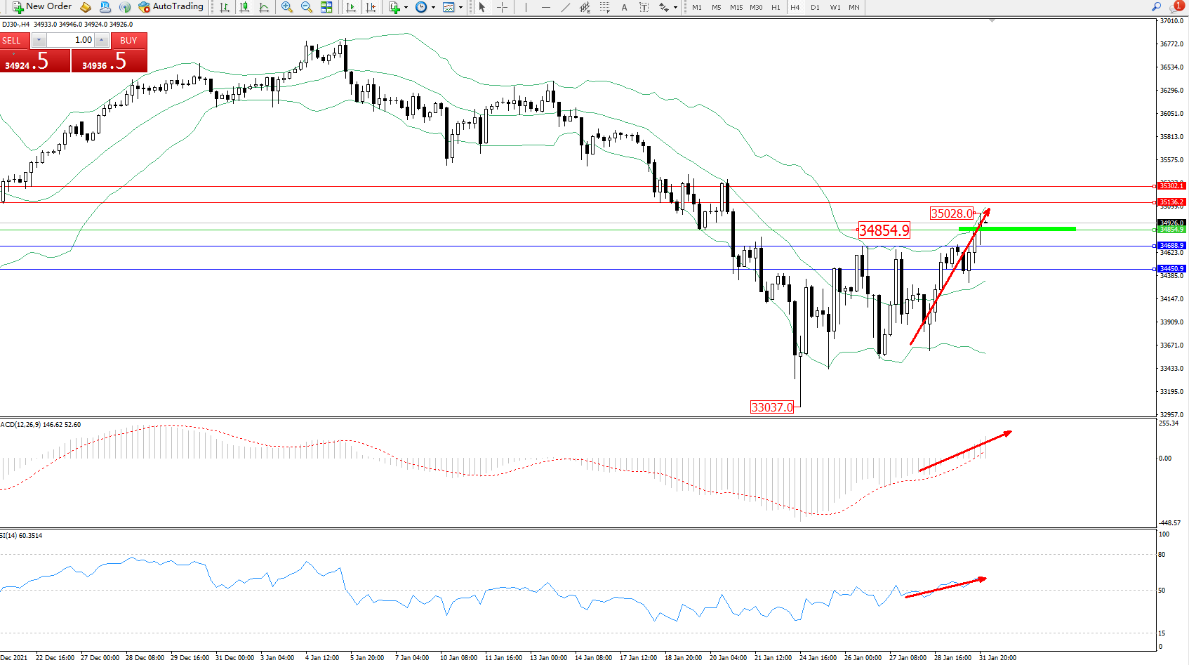 交易策略:34854上方看涨,目标35136、35302
