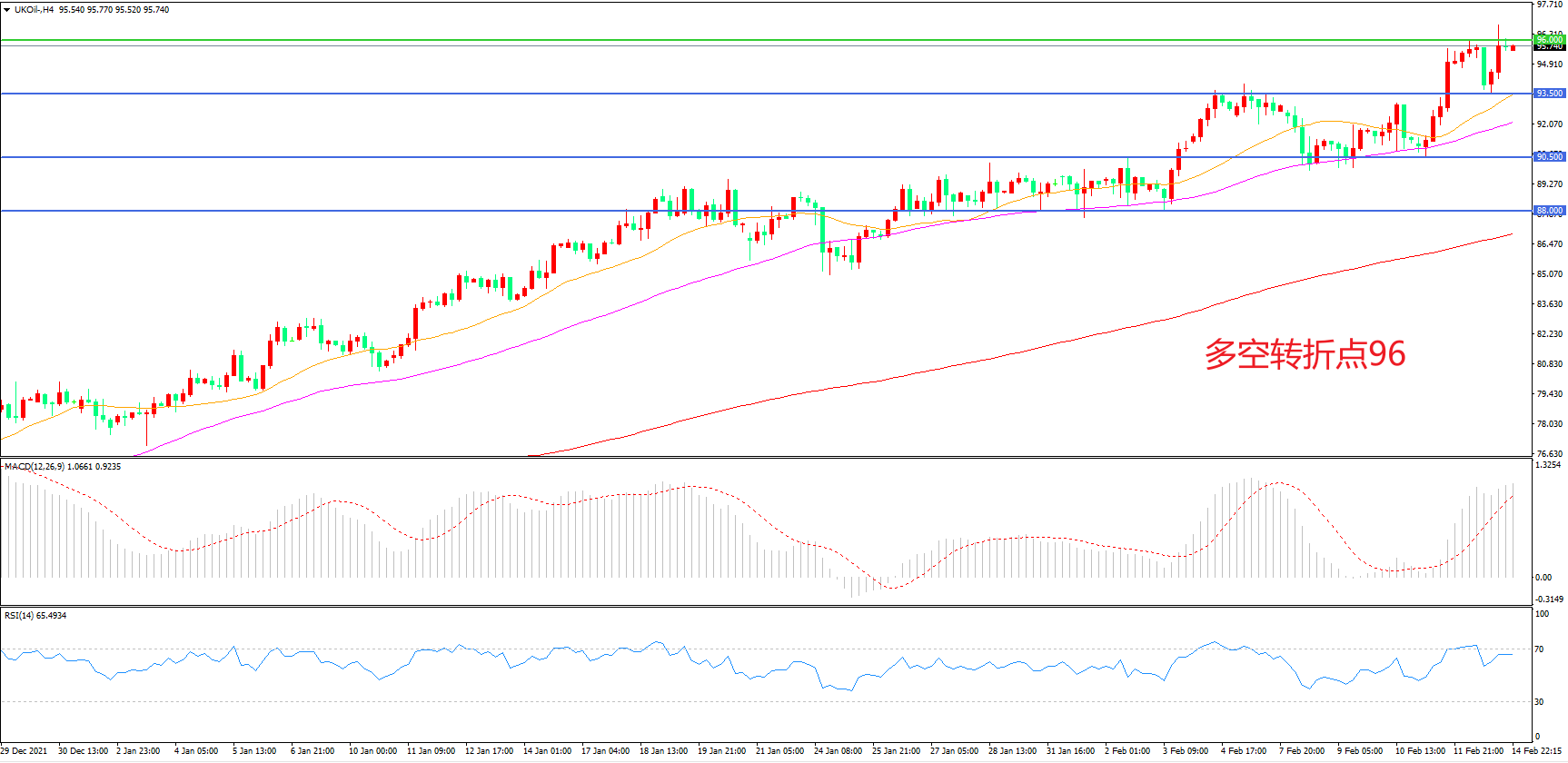 4小时图看,油价回踩93.5美元后再度上行,短期走势偏强, 96美元成为多空分水岭,MACD红柱增加,RSI指标走平,日内震荡上行概率较大。