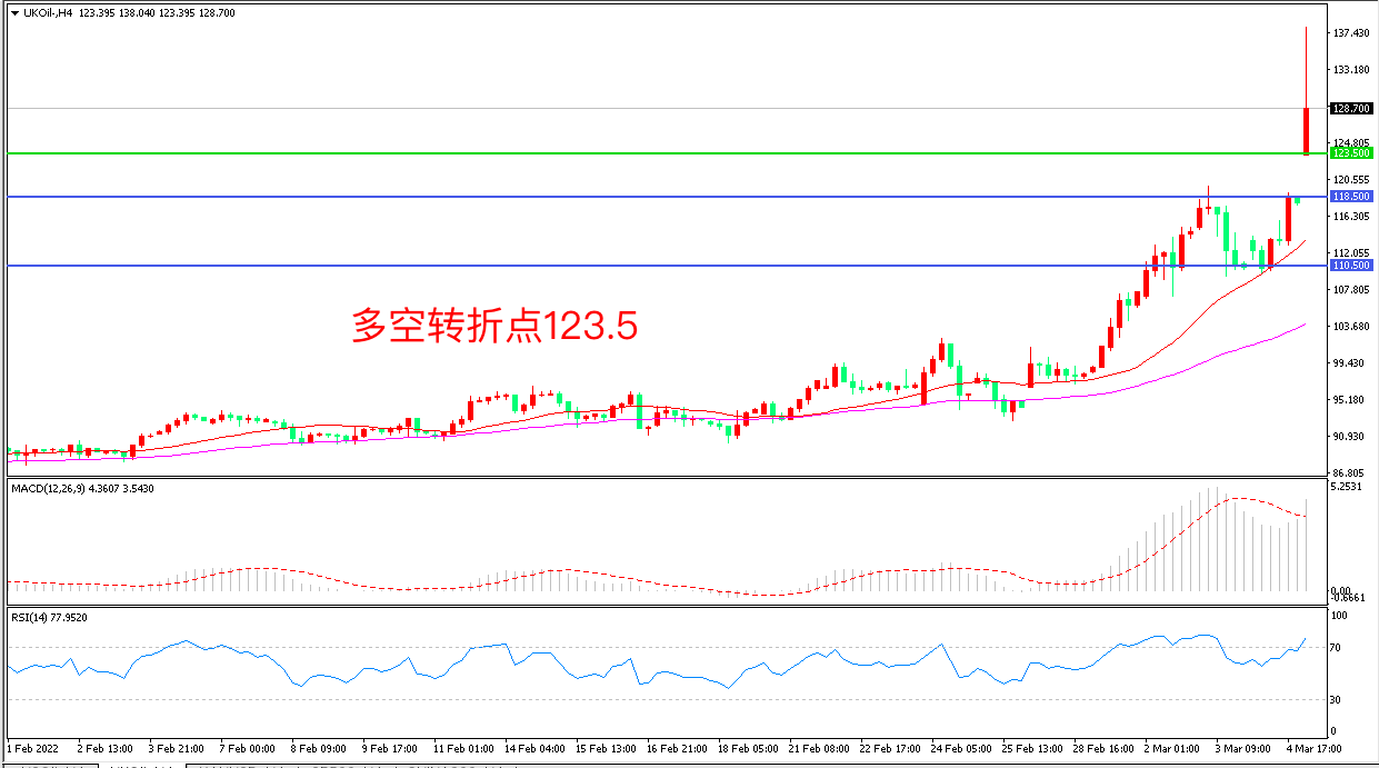 4小时图看,油价跳空高开,短期走势偏强,均线系统呈多头排列,MACD红柱增加,RSI指标走平,日内震荡上行概率较大。