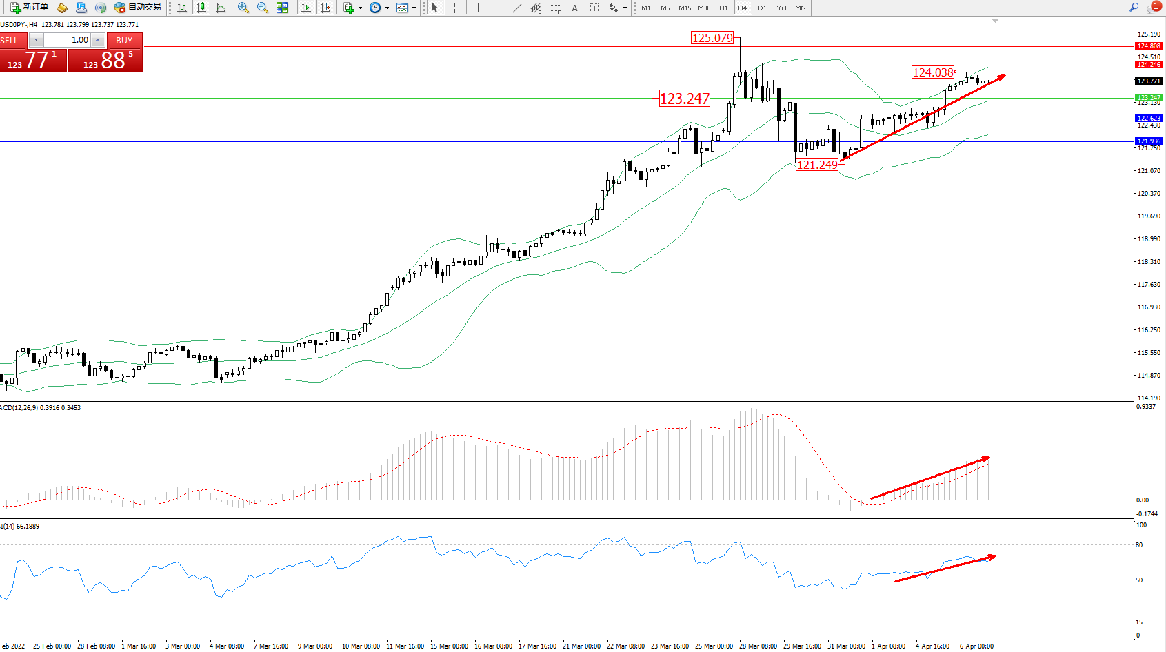 交易策略:123.247上方看涨,目标124.246、124.808