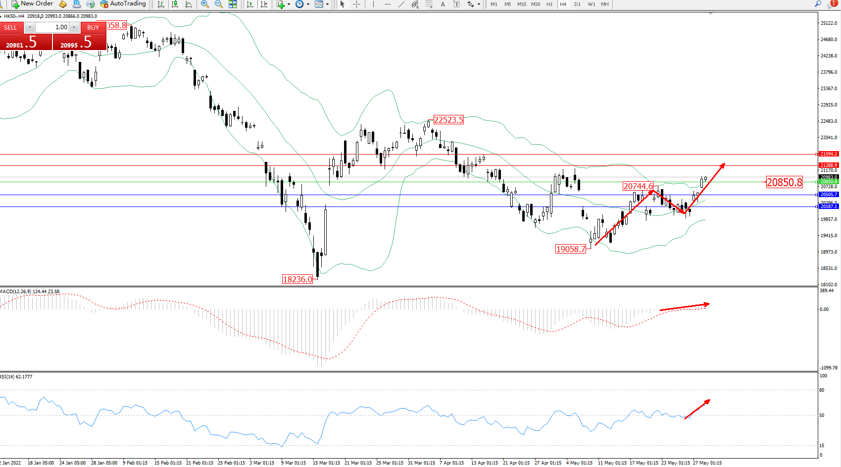 恒指HK50 ——4小时K线图显示: