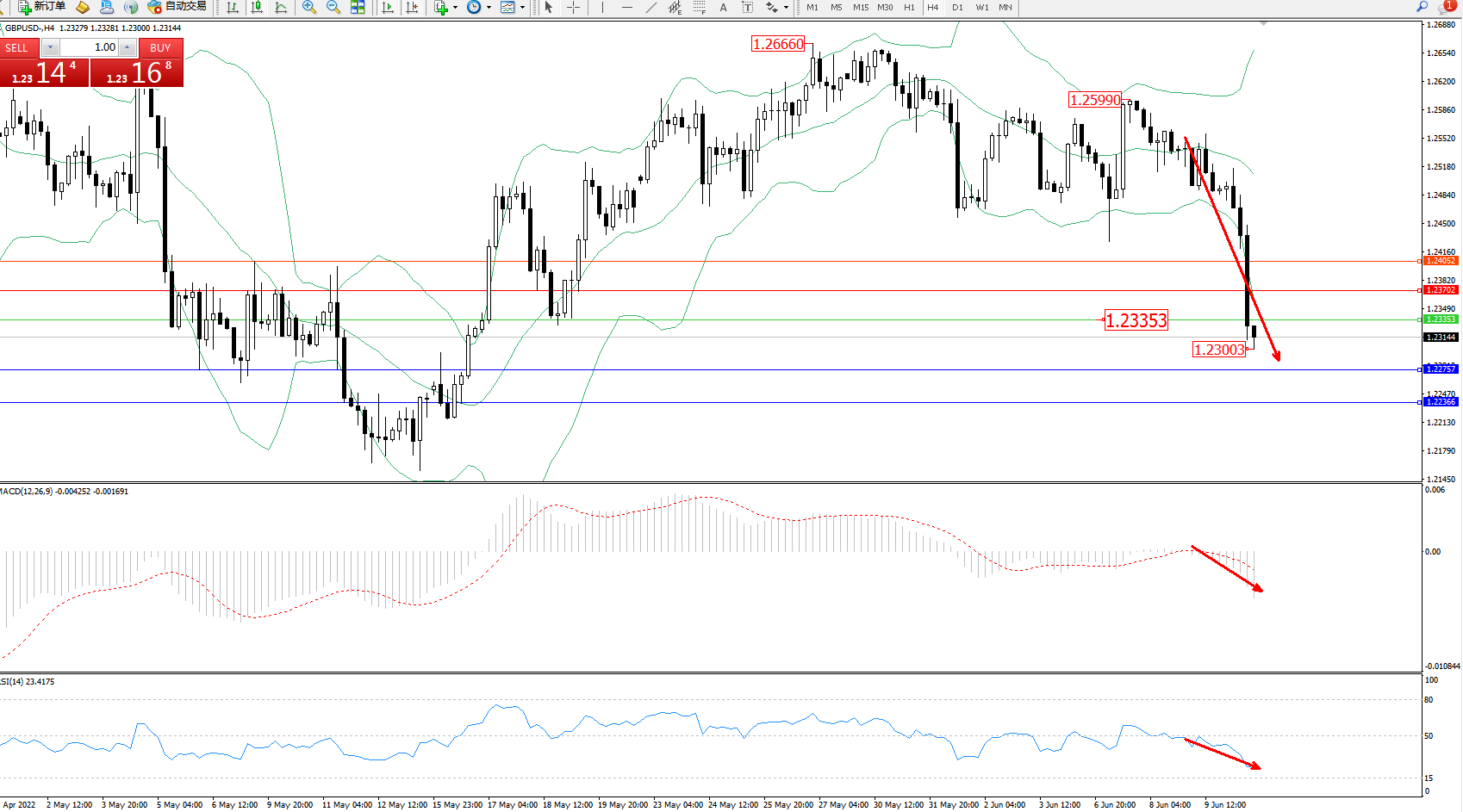 交易策略:1.23353下方看跌,目标1.22757、1.22366