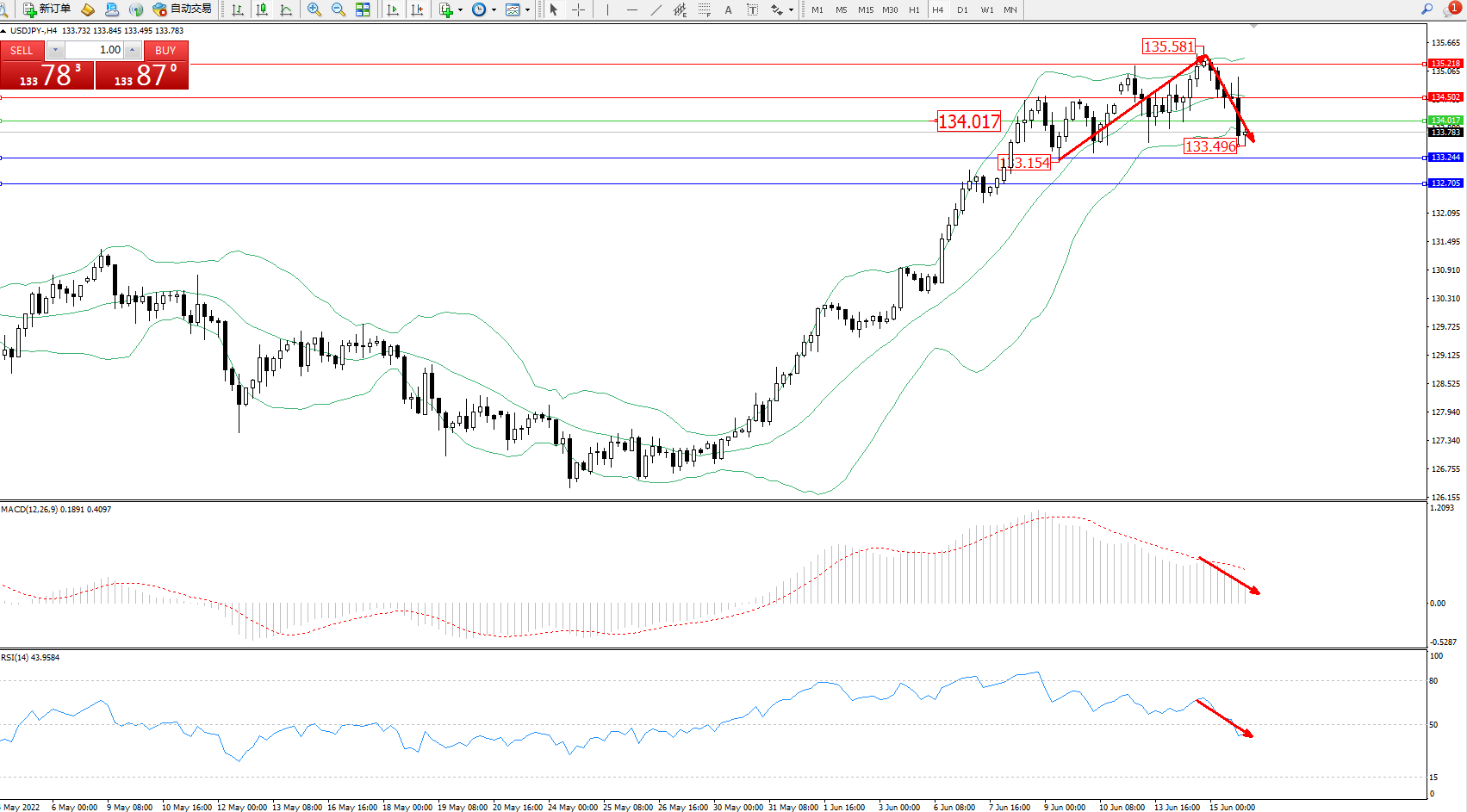 技术点评:多头动力延续布林带指标通道中上轨区间节点持续震荡上扬,高位抵达135.581附近节点后遇阻回撤,跌破布林带指标下轨至133.496附近节点后震荡,布林带指标呈收口走势中,MACD指标处于多头区域维持震荡缓慢下行,RSI指标空头动力维持震荡下行至50均衡线下侧徘徊;
