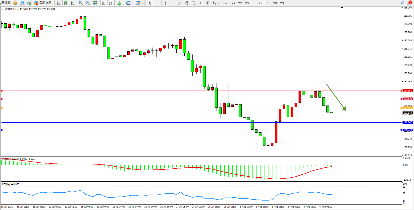 交易策略:133.130下方看跌,目标132.247、131.774