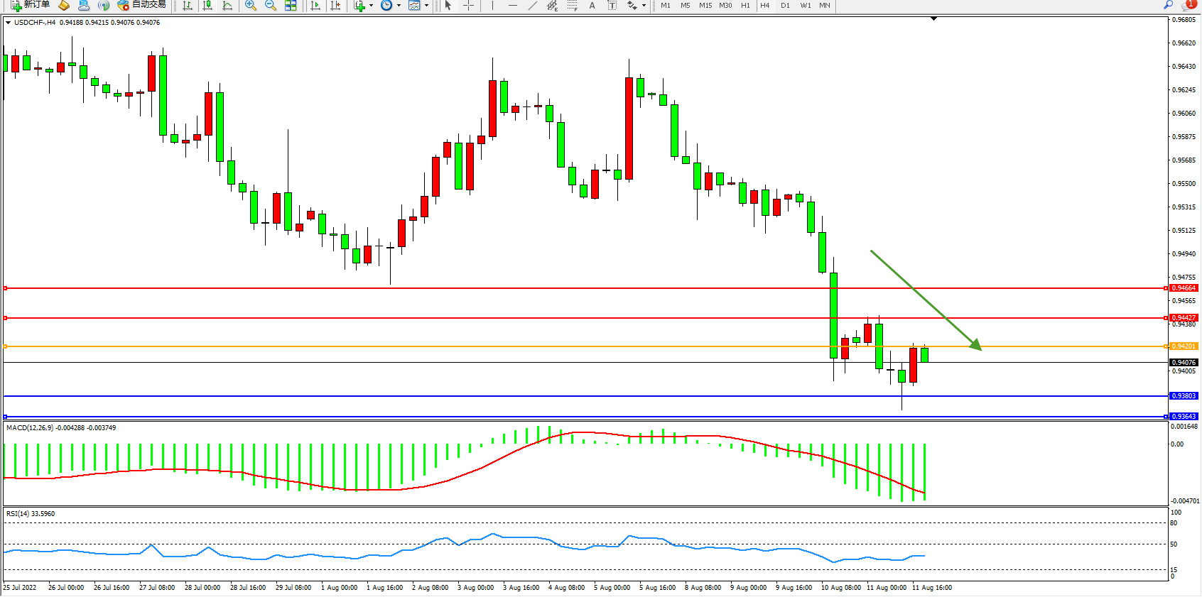 美元瑞郎USDCHF——4小时K线图显示: