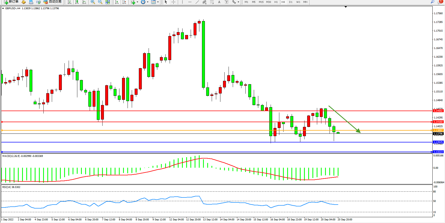 交易策略:1.13897下方看跌,目标1.13525、1.13223