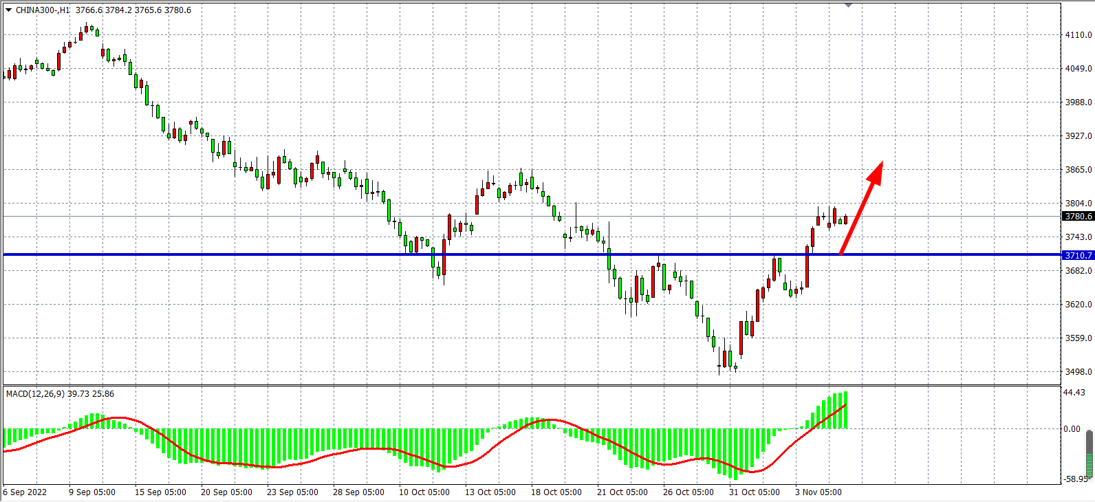 1小时图看,沪深300在3710之上持续走强,同时MACD量能在零轴之上持续放大,显示行情有进一步上升空间。日内在3710之上继续看涨为主,上方目标3850-3900