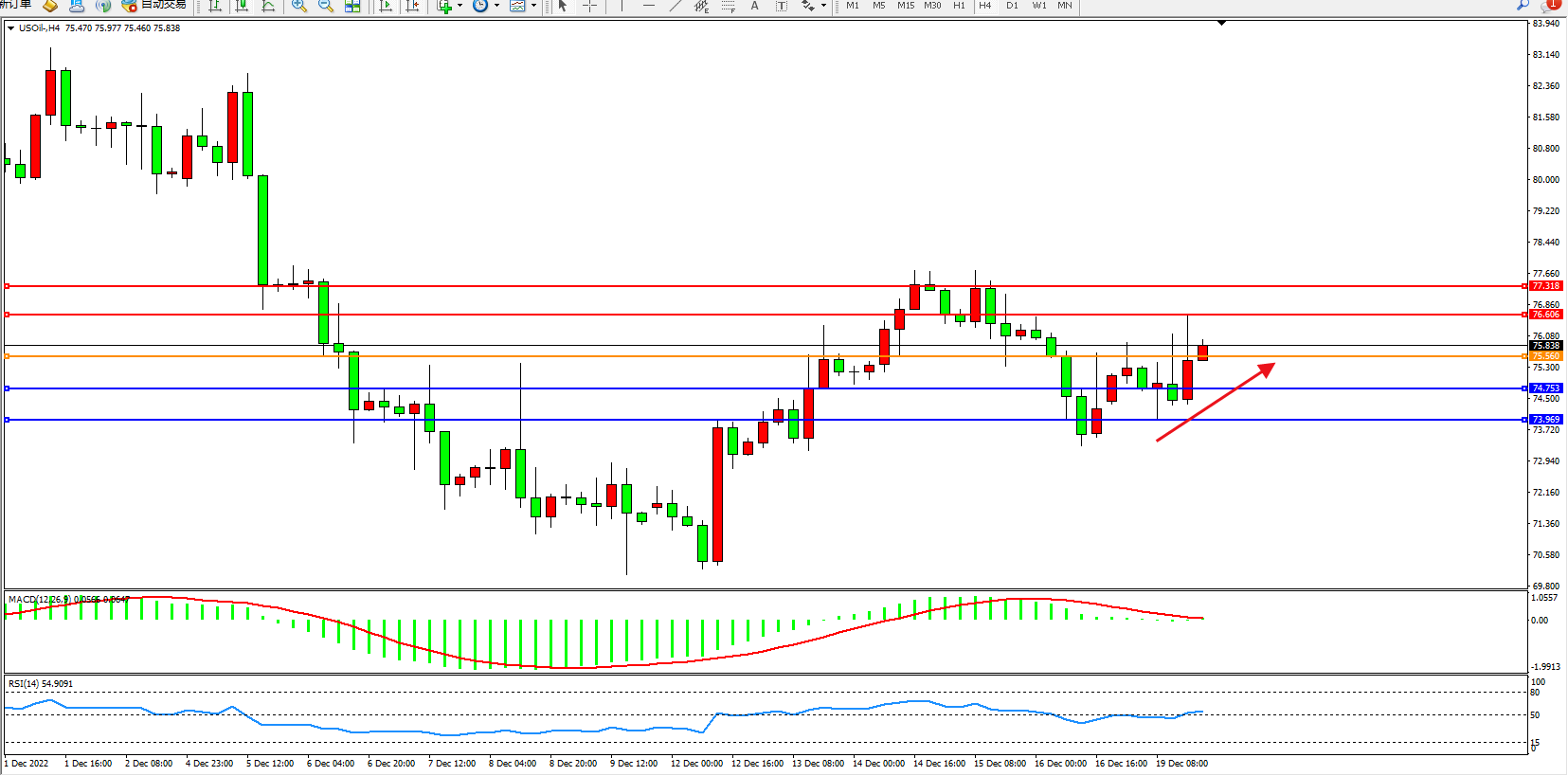 交易策略:75.560上方看涨,目标76.606、77.318