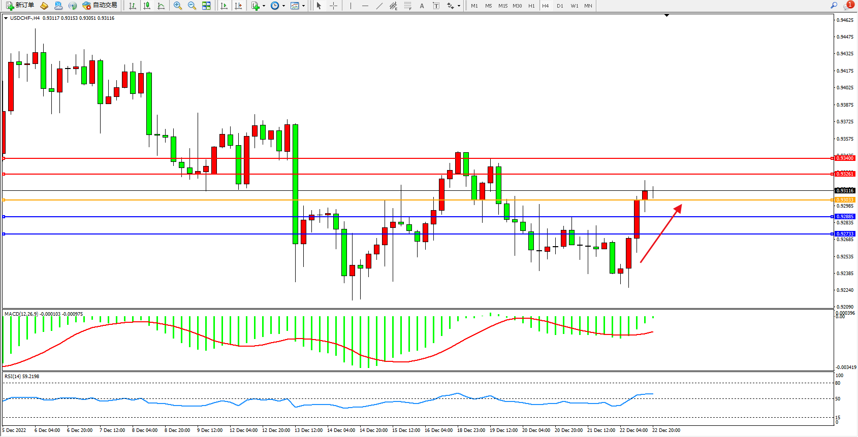 美元瑞郎USDCHF——4小时K线图显示: