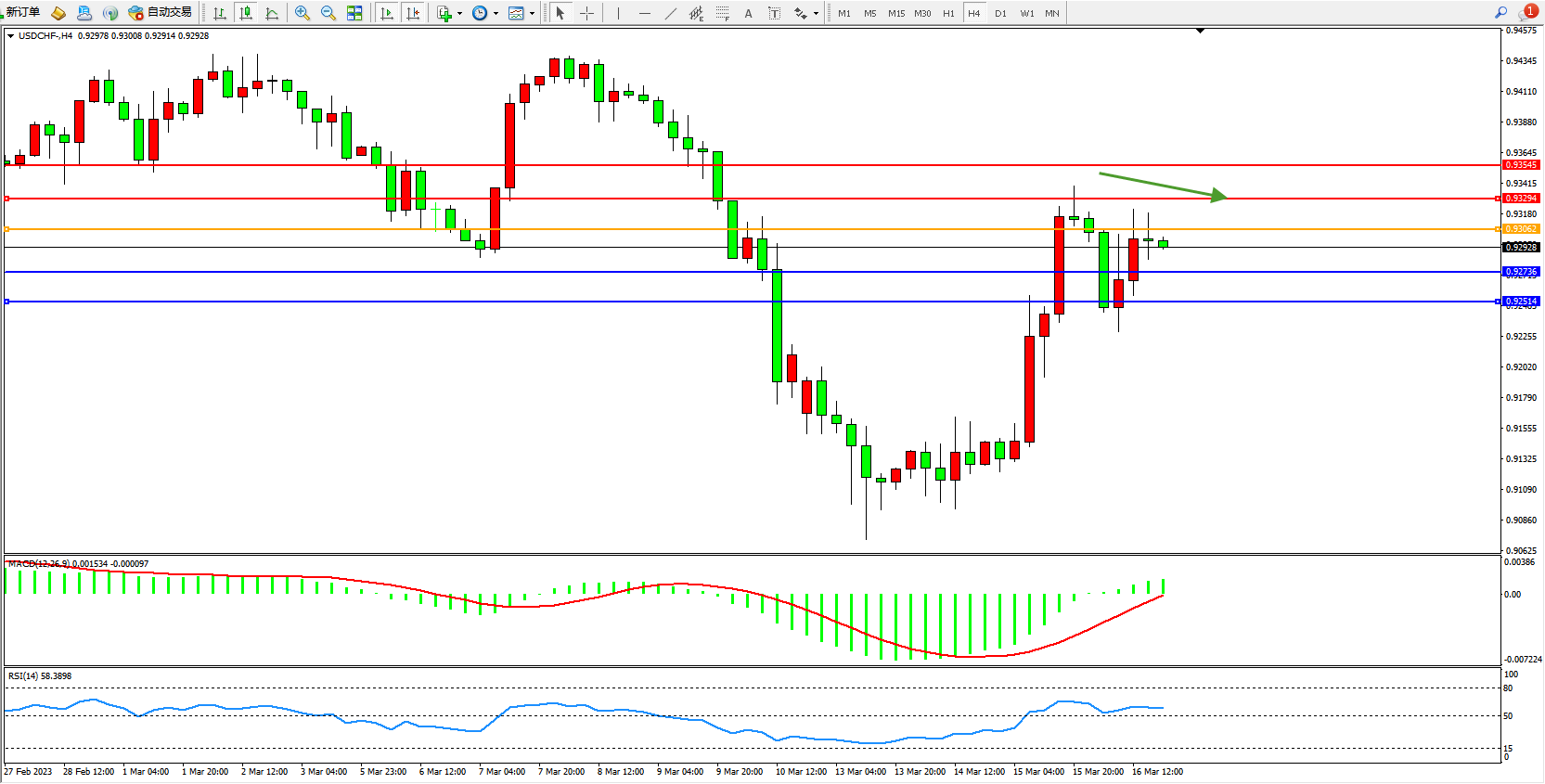 美元瑞郎USDCHF——4小时K线图显示:
