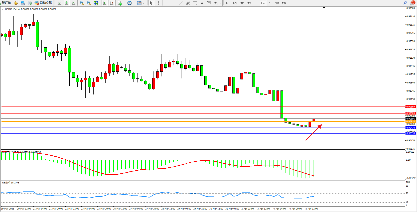 美元瑞郎USDCHF——4小时K线图显示: