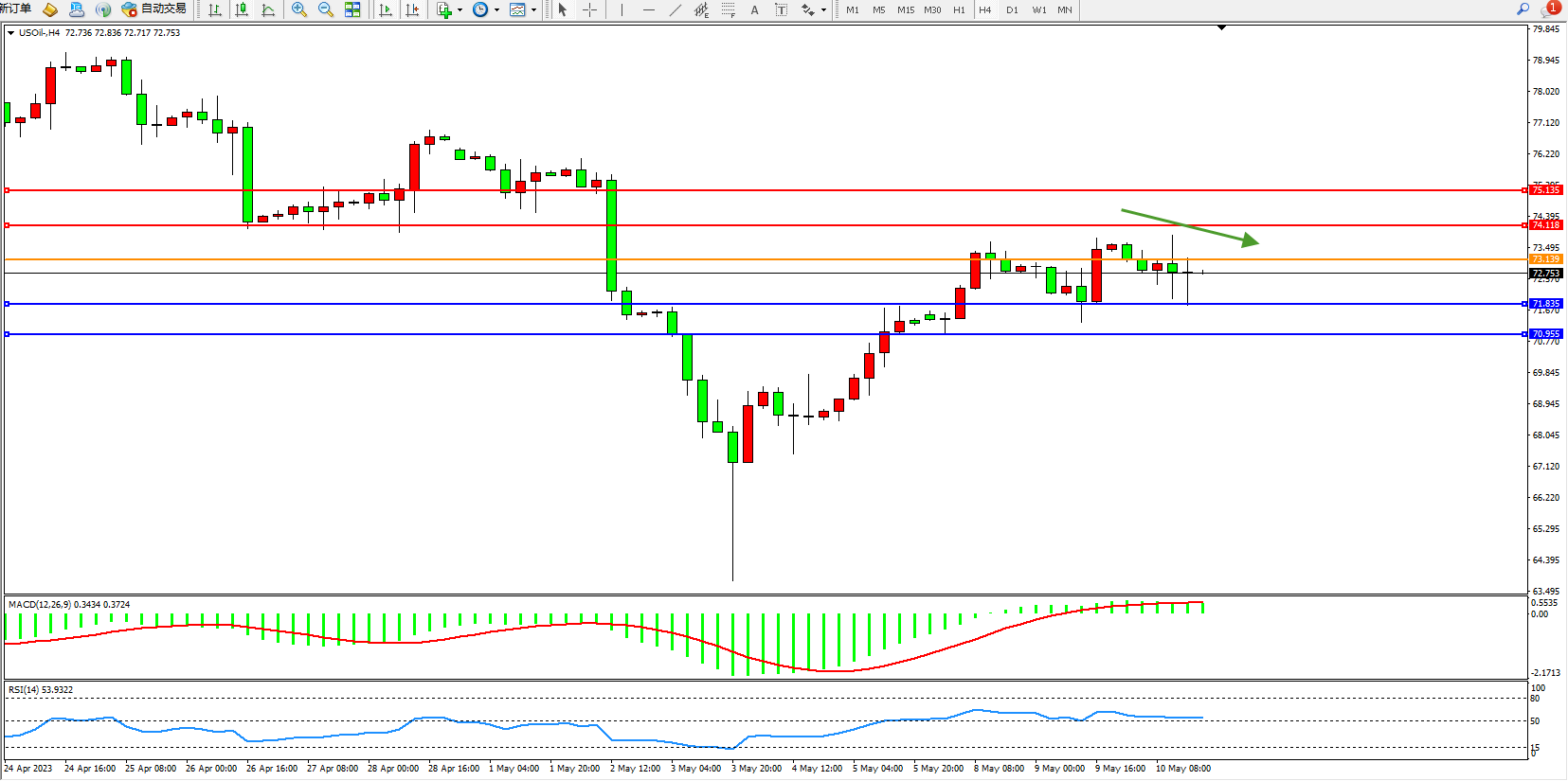 交易策略:73.139下方看跌,目标71.835 70.955