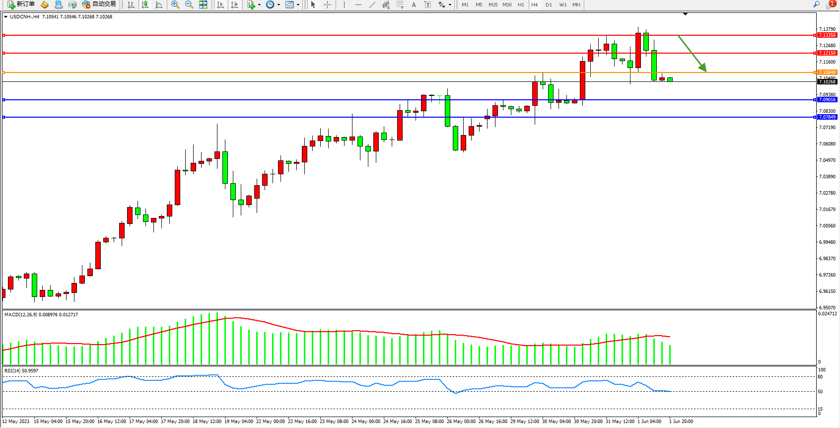 美元人民币USDCNH——4小时K线图显示: