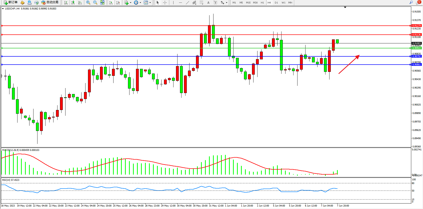 美元瑞郎USDCHF——4小时K线图显示: