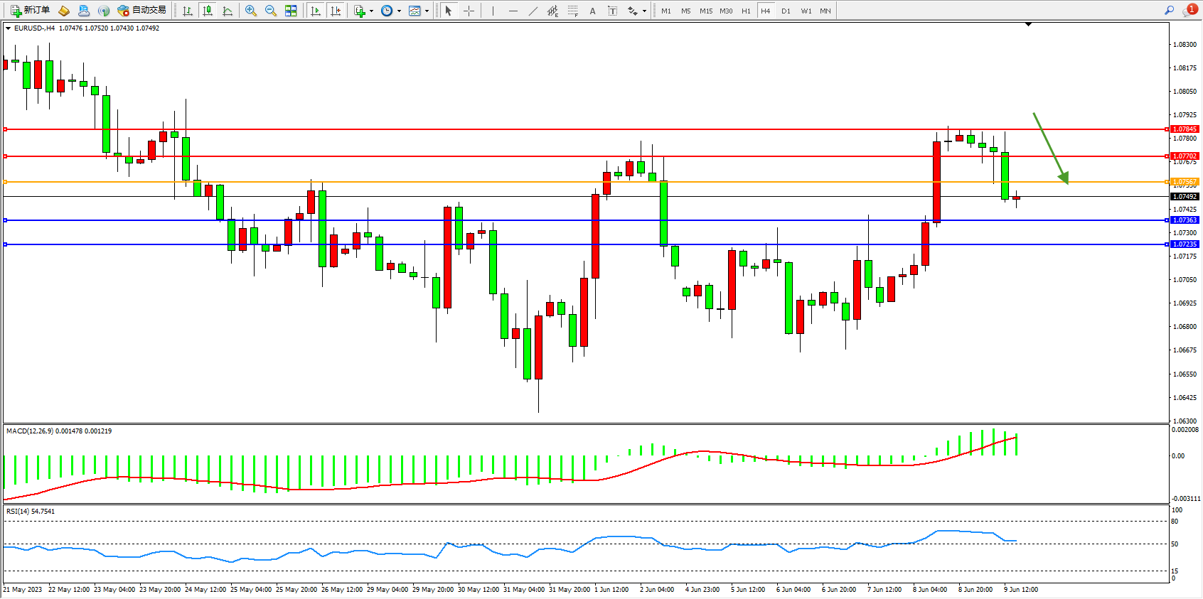欧元兑美元维持1.07492附近震荡,欧洲央行将于6月15日将存款利率上调25个基点至3.50%。市场预计欧洲央行将于7月将存款利率上调至3.75%。