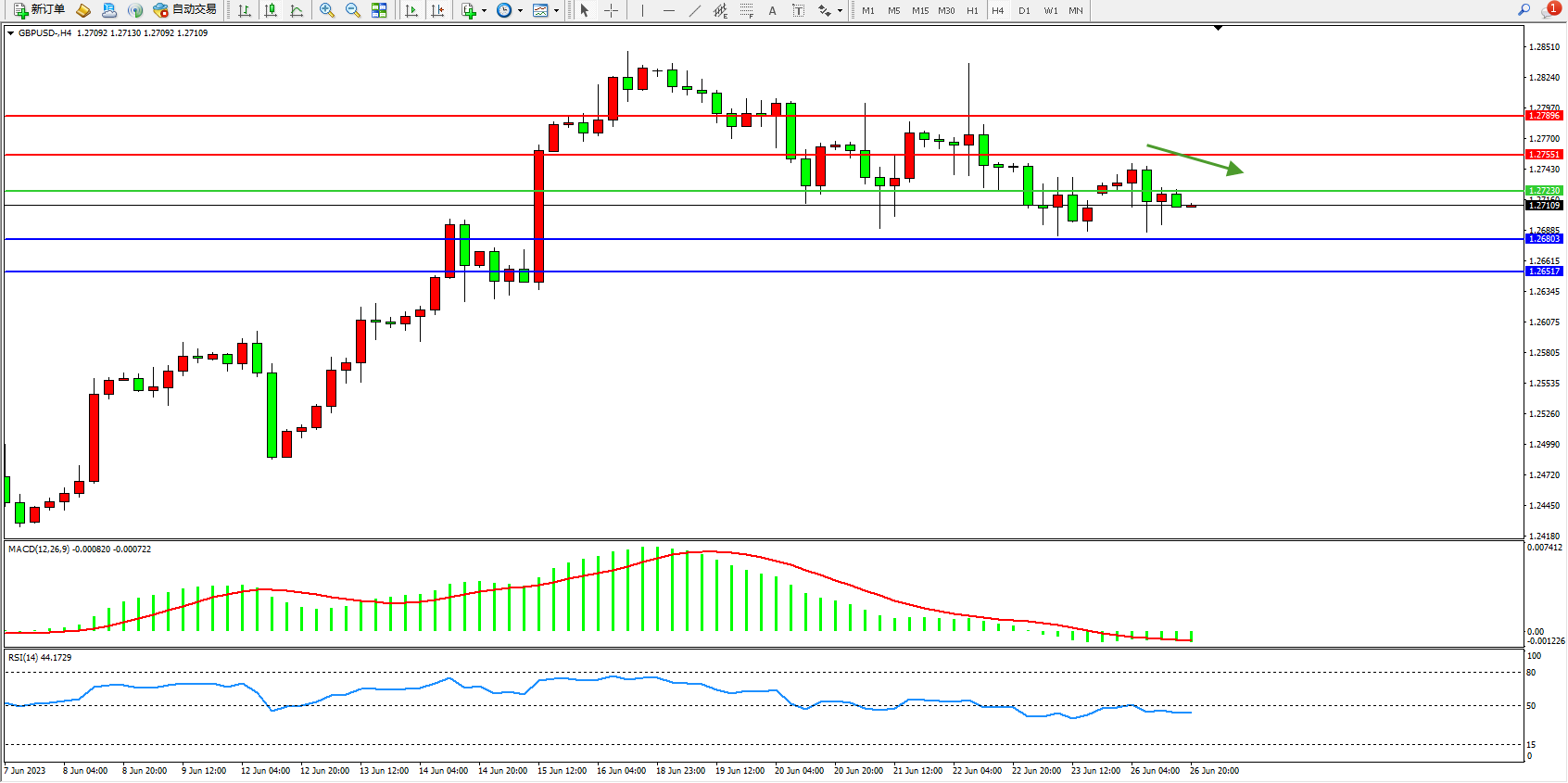 交易策略:1.27230下方看跌,目标1.26803  1.26517