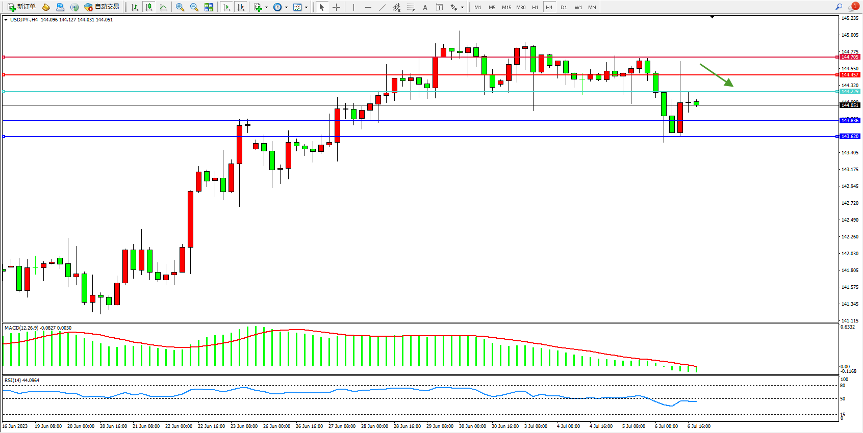 交易策略:144.229下方看跌,目标143.836 143.620