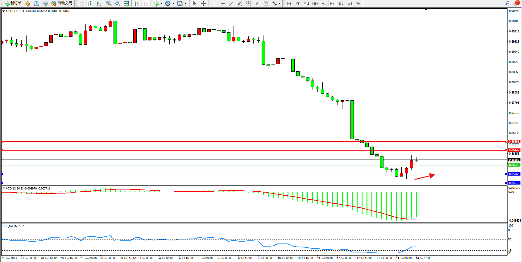 美元瑞郎USDCHF——4小时K线图显示: