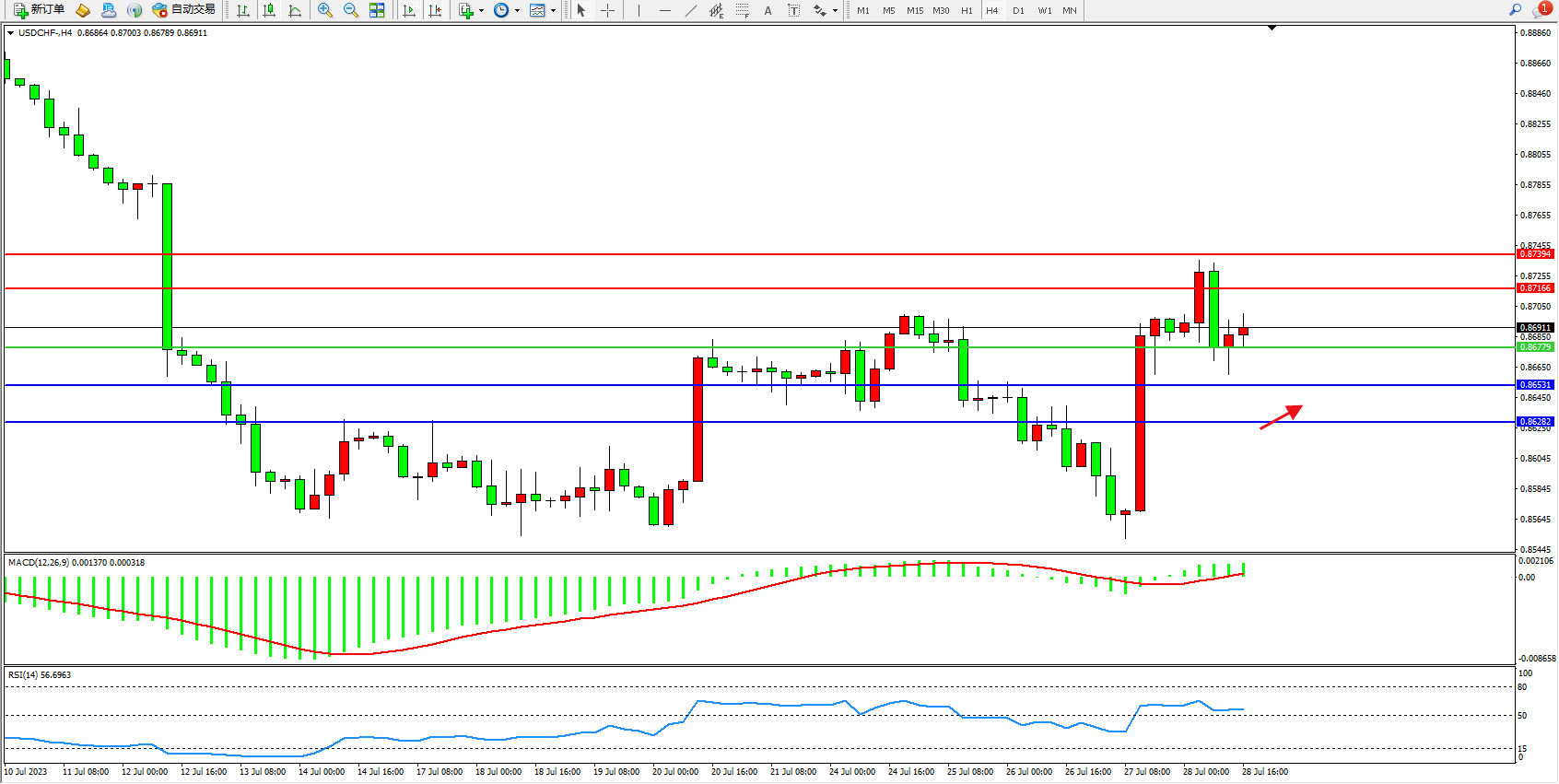 美元瑞郎USDCHF——4小时K线图显示: